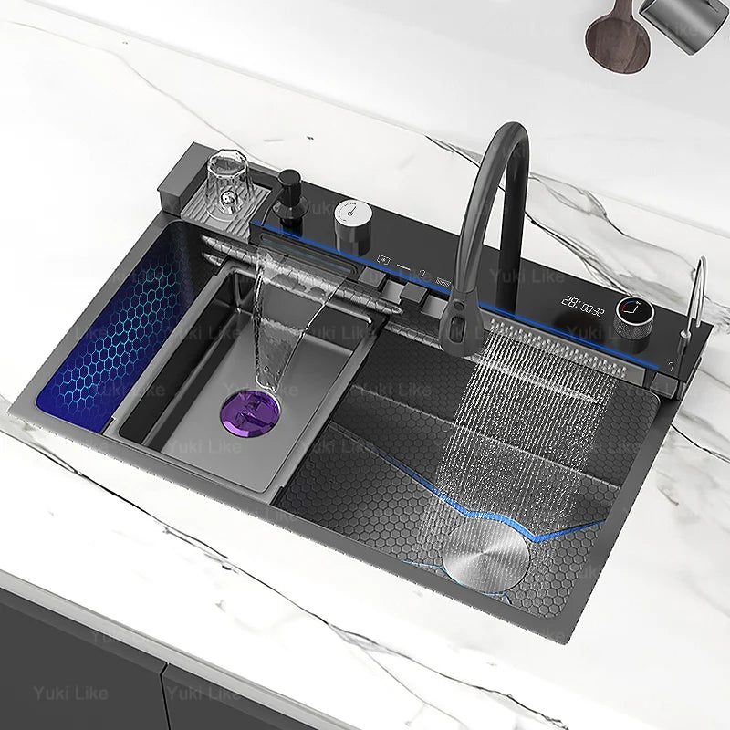 Stainless Steel Waterfall Kitchen Sink Extra Large Single Slot Digital Display Faucet Set Cup Washer Wash Basin 100*50cm